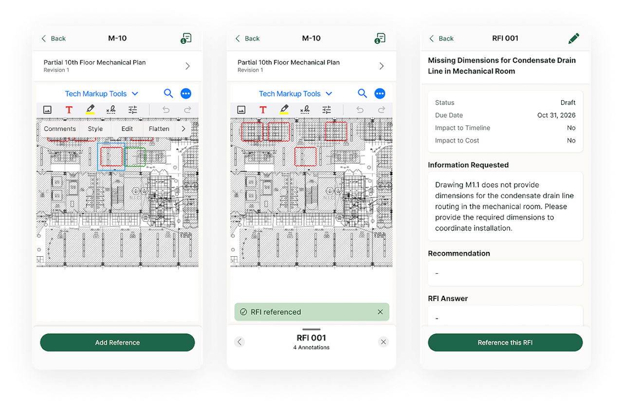 - RFIs, submittals, drawings, and PDF markup